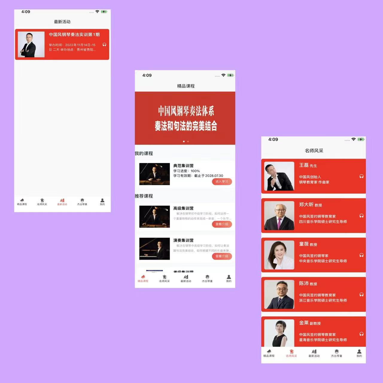 主要由典范集训课程、高级集训课程和演奏集训课程三部分视频课程组成。典范集训课程解决在钢琴入门和初级阶段,如何用“钻”“放”“走”“回”“移”“挥推”“起”“串”等具体方法,规范手指触键,掌握重量转移,建立美好的听觉,依托《精编中国风钢琴入门教程》1-3册来讲解;高级集训课程解决在钢琴初中级学习阶段,如何运用一个重量转移的动作来完成串音、一个乐节乃至一个乐句的弹奏,如何让弹奏的动作轨迹能合乎音乐表现的逻辑的问题,依托《精编中国风钢琴进阶教程》1-5册来讲解;演奏集训课程解决在钢琴中高级学习阶段,如何让奏法跟句法完美结合,如何根据不同的乐曲来弹出不同的音色,如何让手指形成游刃有余的弹奏能力,如何有能力把适合在音乐会上表演的曲目保留在手头的问题,依托《中国风钢琴演奏教程》来讲解